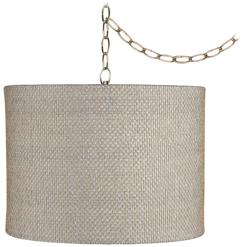 Gray And Gold Plastic Weave 15″ Wide Antique Brass Plug-In Swag Chande