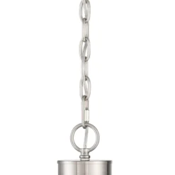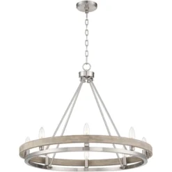 This open design offers an elegant touch for modern coastal, farmhouse or rustic room design. From the Possini Euro Design brand, the fixture was inspired by round wagon wheel and ring chandeliers. It features eight lights arranged on the inside of the ring. The canopy, ring frame, and support rods come in a sleek brushed nickel finish. The second ring has a faux distressed gray wood finish that adds an elegant finishing touch.