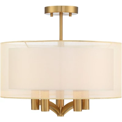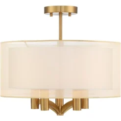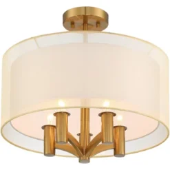 This semi-flushmount ceiling light offers a chic and simple design. It has a double drum shade, with a sheer outer shade over a white linen shade, and is enhanced by gentle warm brass accents. The result is an elegant look, perfect for living room, dining room, or kitchen.