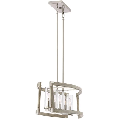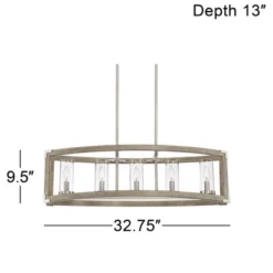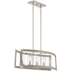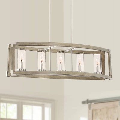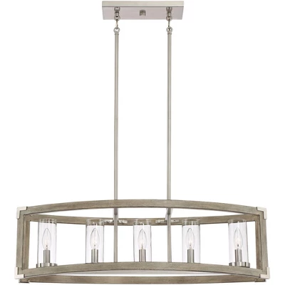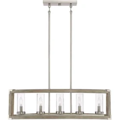 Perfect over a kitchen island or counter, this lighting fixture offers a sleek industrial update of classic rustic design. The linear steel frame comes in wood and brushed nickel finishes, resulting in a modern farmhouse look with natural charm. Five clear glass shades are supported in the center, each designed to house a candelabra base bulb.