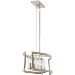 - Wood and brushed nickel finishes. Steel construction. Clear glass cylinder shades.