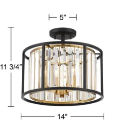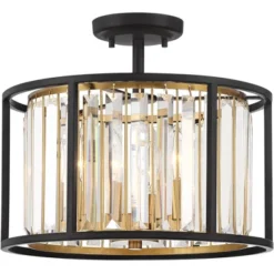 Use this glamorous modern ceiling light to enhance the look of any room. An open cylindrical frame in a bronze finish encloses the inner cylindrical frame in a brass finish, and accented with clear crystals. The three bulbs housed inside create lively illumination.