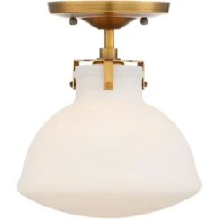 A semi-flushmount ceiling light that’s perfect for living rooms, bedrooms, closet spaces, hallways, and more. This fixture comes in a gold finish frame, which supports a shapely opal glass shade that hangs from the bottom. Add Mid-Century Modern lighting to your home with this lovely ceiling light design.
