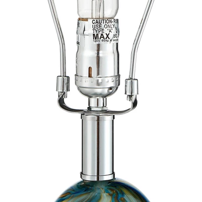 Swirling colors offer a hypnotic effect that transforms this glass table lamp into a functional work of art. Possini Euro Design® styled this elegant lamp from hand-blown art glass and touched it up with a metal base and accents. A simple on-off switch makes operation a breeze while the included clear, plug-in dimmer allows for easy adjustment of lighting levels.