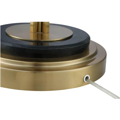 Add a bright new look to a living room or seating area with this luxe design from the Possini Euro Design brand. It features a thin profile with three slender columns and other accents in a satin brass finish. A black marble accent at the bottom offers a dash of sophistication, and up top is an off-white linen shade. You can control the light output with the twin on-off light pulls.