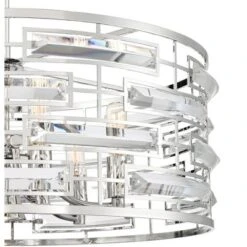A polished nickel finish accentuates the decorative design of this modern crystal pendant with downlight by Possini Euro Design®. Its clear K9 crystal accents demand attention, ensuring this pendant becomes a lovely focal point. There are six tube bulbs arranged around the frame, with a center downlight ideal for illuminating dining table centerpieces.